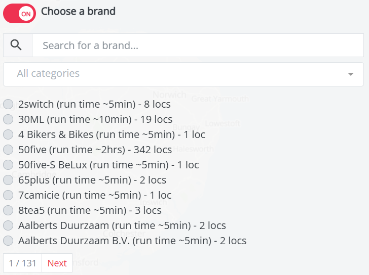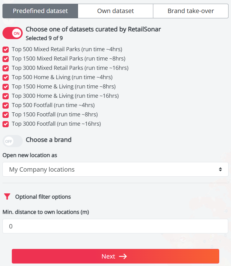 - Choose an existing brand from our datastore: You can do this by selecting the option "Choose a brand" instead of "Choose datasets curated by RetailSonar". This option lets you select all store locations from a specific brand from the list and displays the estimated runtime. You can only select one brand at a time.