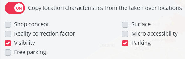 For a brand take-over, you can also copy the characteristics of the selected locations. When enabled, a list of available characteristics will appear, allowing you to choose which ones to apply.