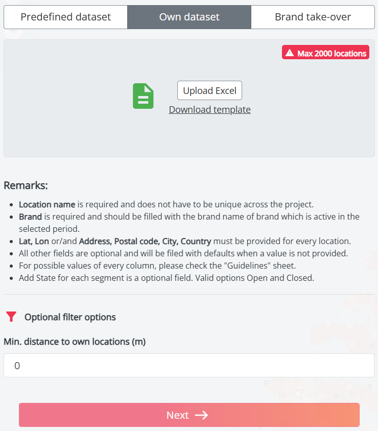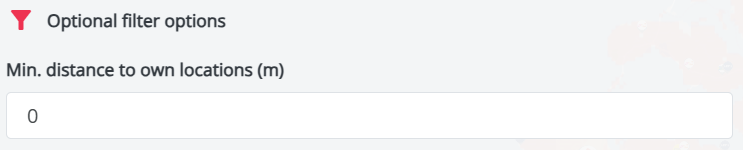 You can define a buffer zone around your own locations by selecting the option "Minimum distance to own locations (m)" This feature helps exclude potential locations within this zone, ensuring a more targeted analysis and preventing cannibalization.