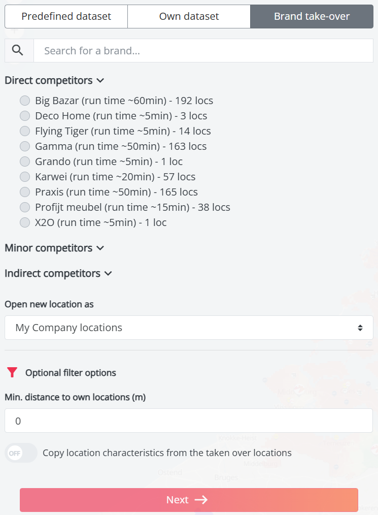 The third option allows you to evaluate competitor locations as part of a brand take-over strategy. You can search for a specific brand using the search bar or select a brand from the categories Direct Competitors, Minor Competitors, or Indirect Competitors by checking the relevant box. Each competitor datasets includes a list of locations for the selected brand. You can further refine the data by adding parameters as outlined in the final section of this article, or proceed directly to the next step: Calculate the project.