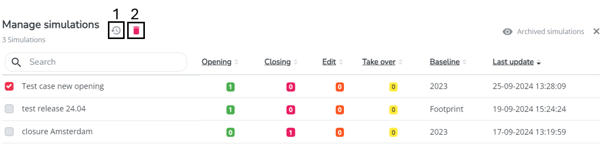 From your archived simulations overview, you can either OR restore the simulation (1) , OR remove (2) it.