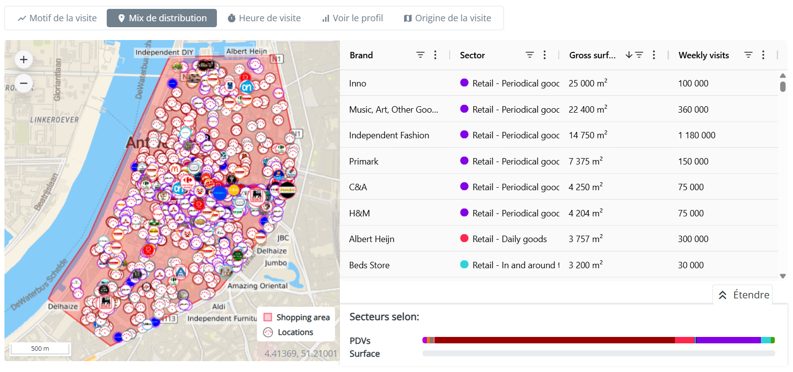 Il affiche les marques sur la carte, avec des informations clés telles que le secteur, la surface totale et le nombre de visites hebdomadaires. Vous pouvez filtrer ou trier les marques en sélectionnant les icônes à côté de chaque catégorie, permettant une vue plus personnalisée. Les marques sont codées par couleur selon leur secteur, ce qui facilite l’identification des différentes catégories.