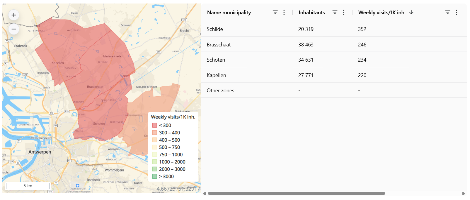 Pour chaque commune, des informations telles que le nombre d’habitants, le nombre de visites hebdomadaires pour 1 000 habitants provenant de cette zone, et la proportion des visites totales apportée par chaque commune sont fournies.