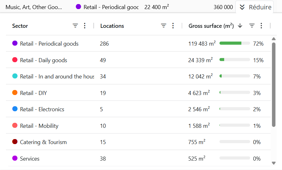 En bas, un menu extensible montre la répartition par secteur, classée par emplacement et surface totale, offrant une analyse plus approfondie de la composition commerciale de la zone.