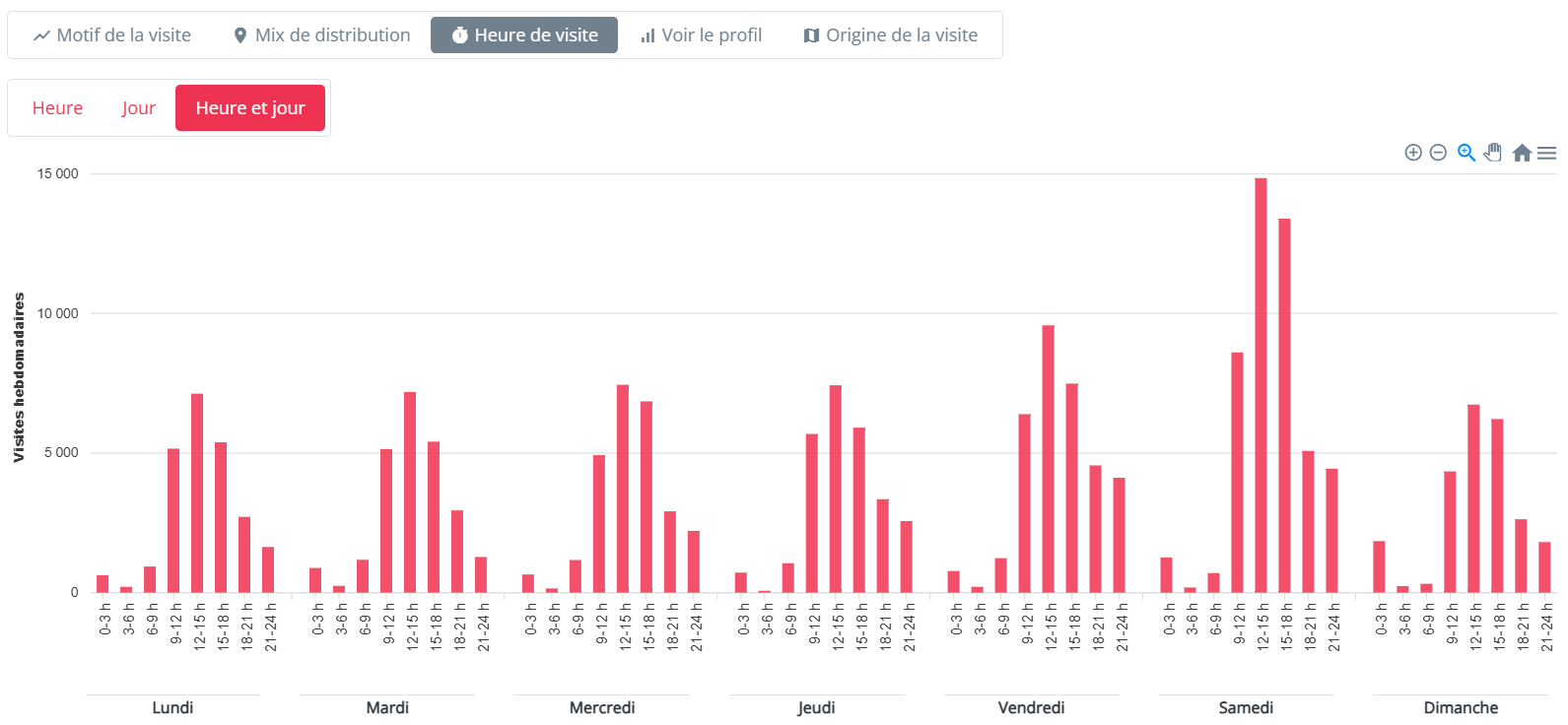 L’onglet Heure de visite affiche le nombre de visites par heure, par jour ou les deux combinés, permettant d’identifier les périodes de pointe.