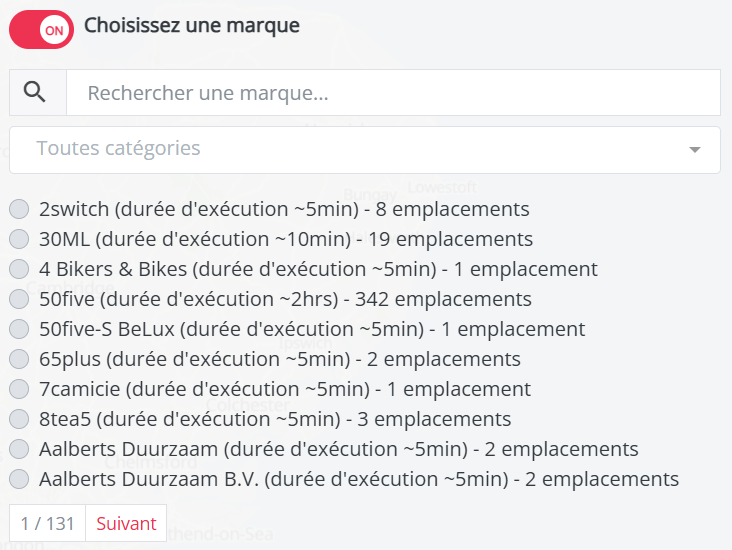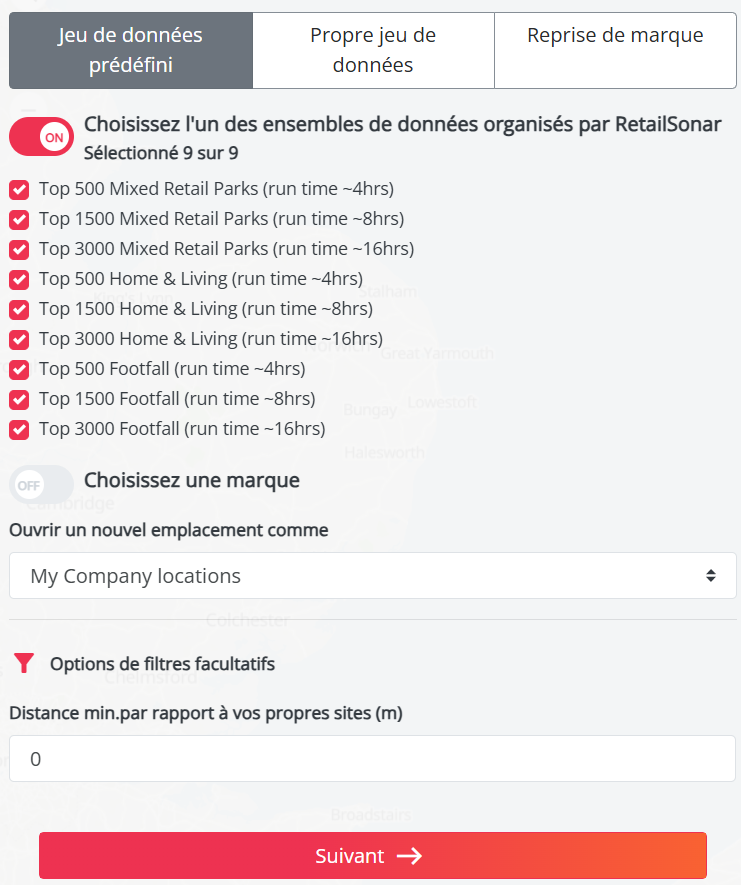 Vous pouvez le faire en sélectionnant l’option « Choisir une marque » au lieu de « Choisir des jeux de données préparés par RetailSonar ». Cette option vous permet de sélectionner toutes les implantations d’une marque spécifique dans la liste et d’afficher le temps d’exécution estimé. Vous ne pouvez sélectionner qu’une seule marque à la fois.