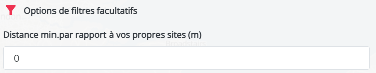 Vous pouvez définir une zone tampon autour de vos emplacements en sélectionnant l'option « Distance minimale par rapport à vos sites (m) ». Cette fonctionnalité permet d'exclure des sites potentiels situés dans cette zone, garantissant ainsi une analyse plus ciblée et évitant la cannibalisation.