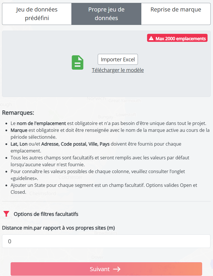 À ce stade du projet, vous êtes invité à sélectionner les sources de données à analyser. Que vous utilisiez votre propre jeu de données, un ensemble d’inspiration prédéfini comprenant des emplacements suggérés, ou que vous procédiez à l’évaluation de sites concurrents dans le cadre d’une opération de reprise de marque, cette étape vous permettra de définir les informations essentielles à votre analyse.