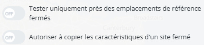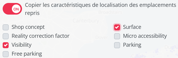 - Autoriser la copie des caractéristiques d'un site fermé vers les nouveaux emplacements à tester. Cette option permet de récupérer leurs caractéristiques principales et de les appliquer aux emplacements testés situés à proximité. Cela garantit que les nouveaux sites évalués prennent en compte les spécificités commerciales et structurelles des anciens emplacements, facilitant ainsi une continuité dans l’analyse des performances de potentiels et de prise de décision.