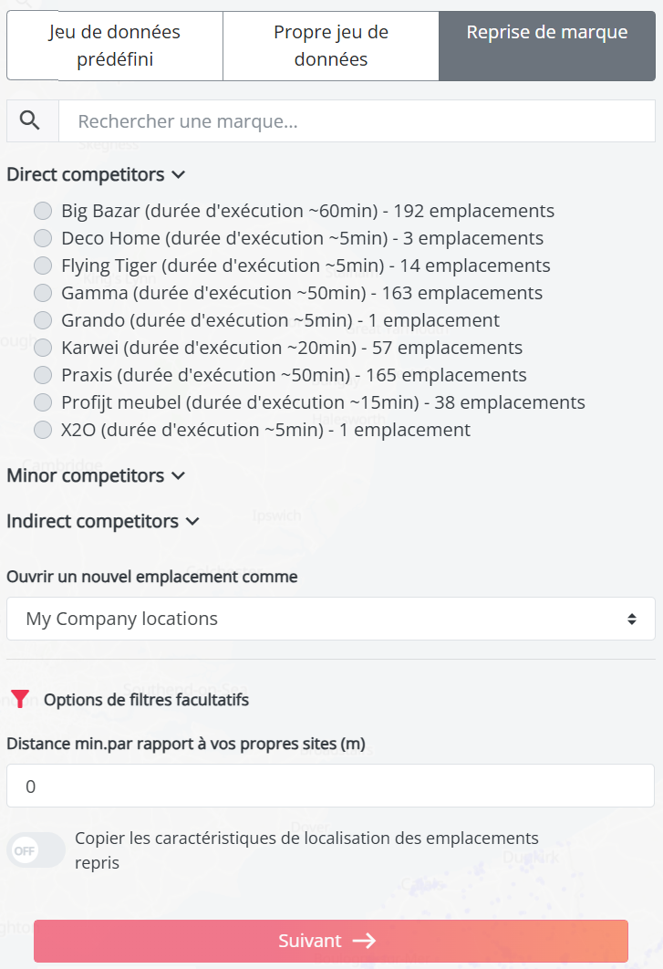 La troisième option vous permet d’évaluer les emplacements des concurrents dans le cadre d’une stratégie de conquête de marque. Vous pouvez rechercher une enseigne spécifique à l’aide de la barre de recherche ou sélectionner une marque parmi les catégories « Concurrents directs », « Concurrents secondaires » ou « Concurrents indirects » en cochant la case correspondante. Chaque jeu de données concurrent comprend une liste des emplacements liés à la marque sélectionnée. Vous pouvez affiner davantage ces données en ajoutant des paramètres, comme expliqué dans la dernière section de cet article, ou passer directement à l’étape suivante : Calculer le projet.